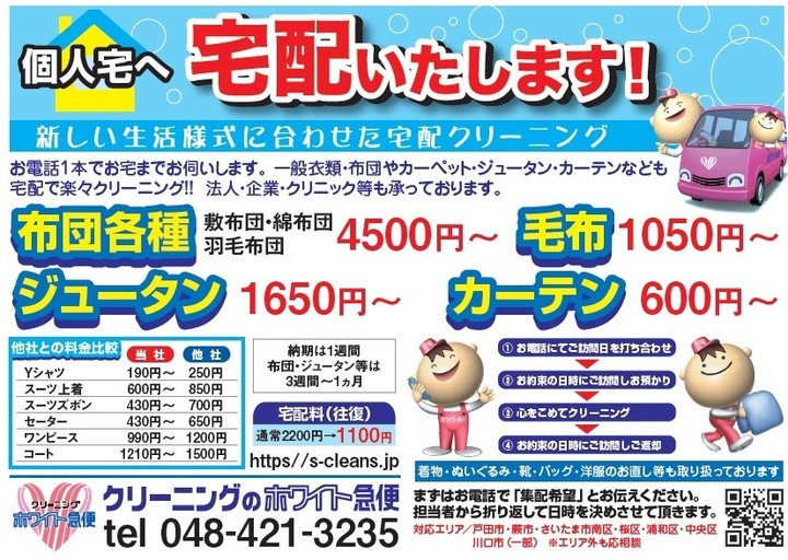 戸田市・蕨市・さいたま市(中央区・桜区・浦和区・南区)に39店舗が営業中、愛情仕上げのクリーニングはエス・クリーニングのホワイト急便浦和にお任せ下さい!